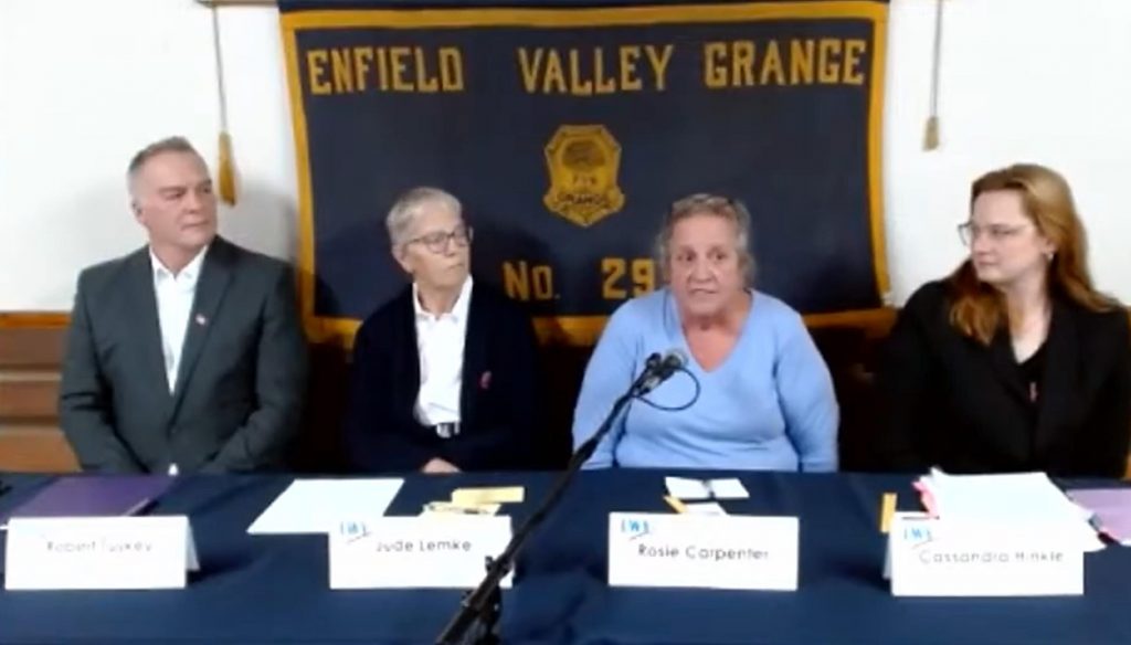 Robert Tuskey and Rosie Carpenter are each challenging incumbent Councilpersons Jude Lemke and Cassandra Hinkle in this year’s Enfield Councilperson races. Carpenter also attended the hearing, but limited her comments to reciting the Pledge of Allegiance.