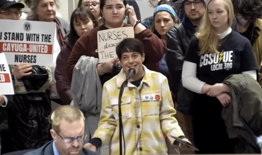 On social media, the Tompkins County Workers Center, the local living wage lobbying group, had urged all union supporters to “fill the chamber” to support the nurses. Its plea succeeded.