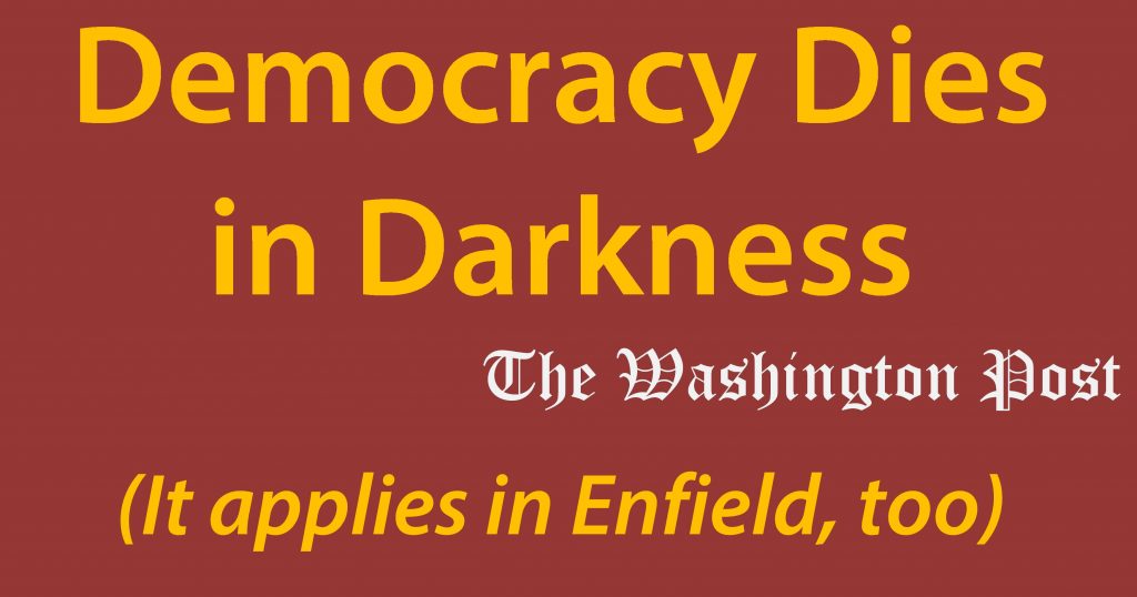 For months, indeed years, I’ve agonized over the conflict that lies at the heart of the decision I must make: How do I fulfill a self-set duty to provide Enfield’s residents, our constituents, timely, accurate information and at the same time honor my foremost responsibility to provide those in Enfield effective, impartial leadership without compromise. With the decision I have reached today, I conclude that I cannot do both.